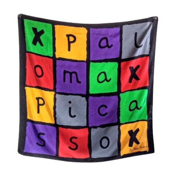 | Product Features | Luxurious pure silk square vintage scarf by Paloma Picasso in her signature logo block print.Excellent preowned condition - light spotting that may be remedied by dry cleaning but no flaws.Measures 35" x 35" square.100% silk.Dry clean only.Made in Italy. | ||
