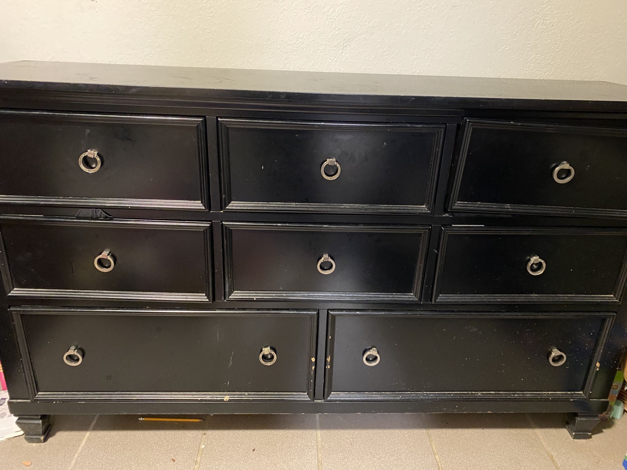| Product Features | Solid wood dresser 36” tall 62” long17” deep Needs a good cleaning but in good conditionMatching bed frame (see separate listing) | ||