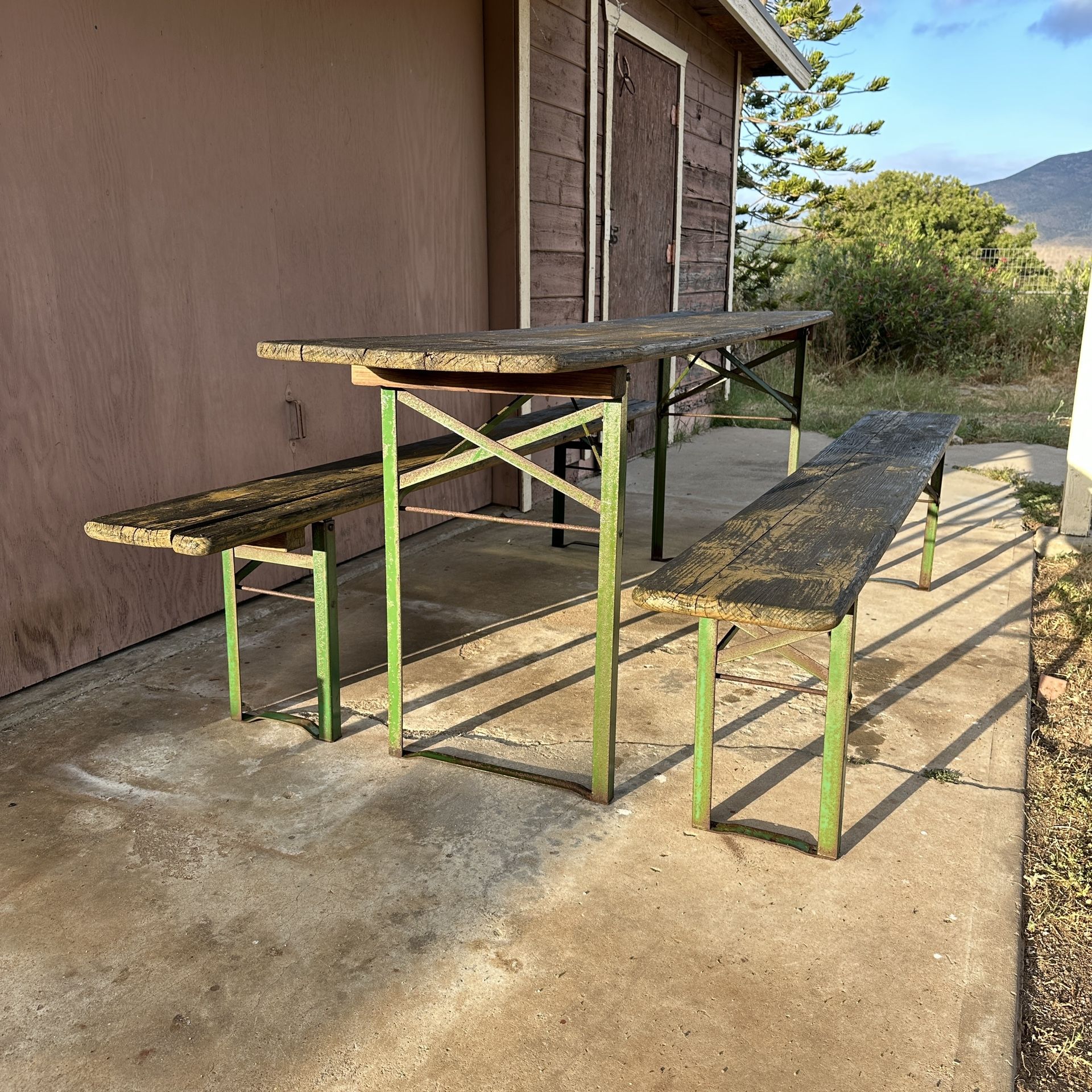| Product Features | Original German Beer Garden Table and Benches from Germany. Vintage/Antique. Original wood and original green metal with patina. Been oiled and all the mechanics work. Table and benches fold up. The last picture is of the same set featured in an ad. Table - 86 1/2L x 19 1/4w x 30 3/4hBench - 86 1/4L x 10 1/2w x 19 1/2h | ||