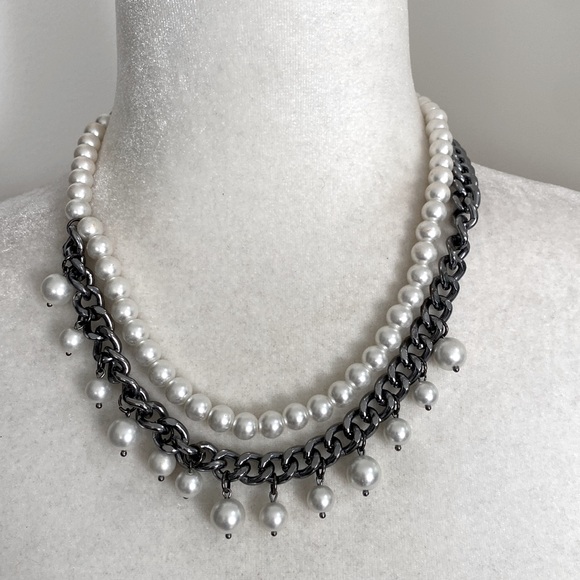 | Product Features | This elegant necklace features a stunning combination of silver and white pearls, perfect for adding a touch of sophistication to any outfit.Edgy Elegant Silver and White Pearl Sophisticated Bohemian Whimsical NecklacePearl strand paired with thick silver chain with dangly pearls giving edgy and sophisticated lookAdjustable Beautiful and fun pieceEdgy Pearl & Gunmetal Chain Fringe Necklace – Bold Contrast for the Fearless Fashionista!Make a striking statement with this ultra-chic layered necklace that blends classic elegance with modern edge. Two strands of lustrous white faux pearls are intertwined with chunky gunmetal chain links, finished with playful dangling pearl drops that add movement and texture. The dramatic mix of soft pearls and tough dark metal creates a perfect balance of feminine and fierce – ideal for elevating a simple blouse, adding grit to evening wear, or layering with other pieces for a personalized look. Crafted with high-quality materials for comfort and durability, this versatile beauty is your go-to accessory for turning heads and feeling powerfully stylish every day.- Pearl and chain necklace- Gunmetal pearl necklace- Fringe pearl necklace- Layered pearl choker- Black chain white pearl jewelry- Edgy pearl statement necklace- Mixed media pearl necklace- Dangling pearl drops necklace- Bold contrast necklace- Fashion pearl chain combo- Women's chunky pearl necklace- Modern pearl fringe jewelry | ||